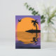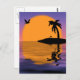 Carte postale d'un coucher de soleil tropical avec un oiseau, un palmier et une fleur sur une île dans l'eau. Un parfait prolongement de la série Flamant rose Sunset.