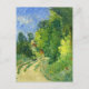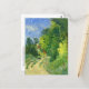 Une carte postale d'art avec la peinture de l'artiste français Paul Cézanne (1839–1906), intitulée - Courbe de la route à travers la forêt (vers 1873–1875), représente un paysage pittoresque avec une route de terre sinueuse encadrée par des arbres verts luxuriants.