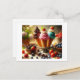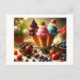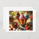 Trois cônes de crème glacée aux saveurs différentes s'assoient élégamment sur un piédestal, entouré d'un assortiment de fruits frais et d'un bouquet luxuriant de fleurs. Des couleurs vives et des détails complexes créent une scène accueillante et délicieuse.
