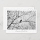 Photo en noir et blanc d'un oiseau noir perché sur une branche d'un arbre. Les branches d'arbres ont des graines pendantes d'eux. Les branches et les gousses de graines créent un arrière - plan abstrait autour du petit animal noir. Copyright photo ©Kimberly J Tilley.