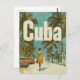 This vibrant vintage postcard captures the timeless spirit of Cuba. A woman strolls down a palm-lined street, surrounded by colorful colonial buildings and iconic 1950s classic cars. The warm, sun-washed tones and nostalgic textures bring the lively charm of Havana or coastal Cuban towns to life. A beautiful tribute to mid-century fashion, tropical scenery, and retro street culture.