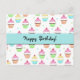 Il s'agit d'une excellente carte postale à envoyer par la poste pour un anniversaire. Il dispose d'un arrière - plan couvert de petits cupcakes. Un graphique d'un ruban bleu traverse le centre avec les mots heureux anniversaire. Le texte à l'avant et à l'arrière sont personnalisables.