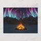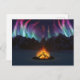 Dans une vallée enneigée, une nuit glacée dans l'hiver, un feu de joie se lève pour faire miroiter les aurores boréales qui remplissent le ciel au-dessus des montagnes lointaines.