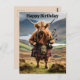 Illustrée avec des vues sur les Highlands écossais, une vache des Highlands drôle debout avec un kilt et portant ses cornemuses.