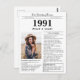 Disez heureux anniversaire avec cette carte postale de style journal, y compris une collection de faits amusants et des faits saillants de l'actualité mondiale de 1991. Faites preuve de créativité et créez un souvenir personnalisé et unique ! Conçu pour ressembler à un journal vintage, il présente des titres personnalisés, du texte et la photo de votre choix.