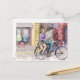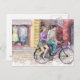 Une fille et un jeune homme à vélo devant les fenêtres des magasins. Aquarelle sur papier. Artiste Zolotareva