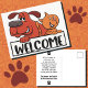 Une carte postale de bienvenue dans notre cabinet vétérinaire avec des chats et des chiens de dessin animé adorables.
