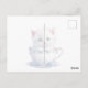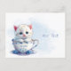 Belle carte postale de chaton dans une tasse avec des fleurs bleues