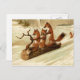 Three little foxes are having a fun ride sledding on a log in the snow in this adorable vintage image.