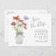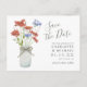 Faire-part de mariage rustique représentant un bouquet de fleurs des champs aquarelles telles que des pavots, des bleuets et de l'herbe dans un grand pot en verre blanc.