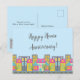 Cartes postales avec écriture fantaisiste "Joyeux Anniversaire de Maison" pour le marketing immobilier. Le design présente un quartier urbain mignon sur fond bleu clair. Parfait pour les agents immobiliers résidentiels, les prêteurs hypothécaires, les agences de titres, les services d'inspection de maisons, etc. Ajoutez vos informations commerciales et votre photo ou logo. L'envoi de cartes postales économise du papier, des enveloppes et du timbre par rapport aux cartes de vœux pliantes.