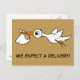 Carte postale de grossesse cool. Une carte postale en carton comique cool avec une cigogne avec bébé et un texte personnel : Nous attendons une livraison ! La façon parfaite et originale de dire à vos amis que vous attendez un bébé !
