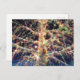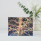 Un arbre sans feuilles avec une pincée de neige scintille de lumières multicolores sur un ciel hivernal sombre. Une petite créature a fait son nid dans le tronc de l'arbre - il y a une minuscule porte rouge avec une couronne de Noël dessus, et le long du tronc, il y a de petites fenêtres rondes qui brillent de la lumière chaude du feu et des bougies à l'intérieur.