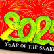 Cette carte dessinée à la main présente un serpent vert se tordant dans la forme 2025. Derrière, des feux d'artifice explosent devant un arrière - plan rouge. Sous elle se trouvent les mots "Année du serpent" écrits en blanc sur un arrière - plan noir. Le style est comme du dessin animé.