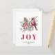 Cette carte postale de vacances confortable présente une aquarelle illustrant un cardinal rouge perché au sommet d'une collection de cadeaux de Noël emballés dans un cadeau et entourée de verdure sainte et métisse et de flocons de neige bleus stylisés. Le mot "JOY" apparaît dans de grandes lettres rouges et muettes qui s'harmonisent avec l'art. Ajoutez le nom de votre famille et l'année en italique gris fusain, et votre adresse de retour sur le dos