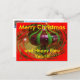 Une ampoule rouge et verte de Noël tournée dans un sapin de Noël,. Avec un cadre rouge clair et coloré qui est sur une CARTE POST DE NOËL! ! ! !