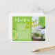Souhaitez un joyeux anniversaire avec une carte postale de recette pour le Mojito, un cocktail cubain traditionnel à base de rhum, de menthe et de citron vert. La carte comprend une photo d'une bouteille versant dans un verre avec de la menthe et du citron vert, des graphiques de rondelle de citron vert et de feuille de menthe, ainsi que la recette. Message d'anniversaire superposé en jaune dans une police amusante.