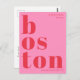 Envoyez un salut élégant depuis Boston Massachusetts avec cette carte postale typographique moderne. Le design présente le mot Boston réparti sur trois lignes en lettres minuscules grasses et décoratives, en rouge vif sur fond rose. Au-dessus, la phrase hallo aus (salutations de) est écrite dans une police sans empattement fine et élégante, ajoutant une touche subtile et moderne. Parfait comme souvenir de vacances, accent décoratif, ou pour envoyer à la maison depuis votre ville préférée. Un design minimaliste mais accrocheur pour les amateurs d'esthétique contemporaine et de souvenirs de voyage.
