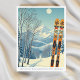 Bonjour des montagnes enneigées de Snowshoe, Virginie-Occidentale, États-Unis ! Nous espérons que vous passez de merveilleuses vacances de ski. Cette carte postale présente un magnifique paysage montagneux bleu-gris avec des planches de ski rétro dans un motif tribal orange.