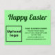 Joyeux Pâques ! Je vous souhaite une Pâques remplie d'espérance, de foi, de joie, d'amour et de paix ! Un jour férié et une saison pour fêter ce mars ou avril et pour annoncer également votre entreprise. Carte postale verte pâle avec accueil de Pâques que vous pouvez customiser en téléchargeant votre logo d'entreprise et en tapant votre nom d'entreprise, adresse, numéro de téléphone, e-mail et site Web ou page de médias sociaux. Customisez-le et utilisez-le pour accueillir vos clients ou clients cette Pâques et comme matériel marketing pour annoncer votre entreprise ou promouvoir votre marque. Carte postale de vacances personnalisable que vous pouvez utiliser pour développer la sensibilisation de marque. Veuillez vérifier l'apparence après avoir téléchargé le logo et tapé des textes. Si l'apparence vous plaît, vous pouvez passer votre commande maintenant. Si vous avez besoin de redimensionner et repositionner le logo et les textes pour s'adapter à cette carte postale de vacances, s'il vous plaît ajuster dans l'outil de conception. Vous pouvez également modifier le style de police, la couleur de police et la couleur arrière - plan dans l'outil de conception. Joyeux Pâques et vous souhaitant plus de ventes.