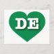 Cette carte postale est dotée d'un coeur vert vif contenant les lettres coques en haut, blanches et audacieuses DE, l'abréviation officielle du Delaware, premier état. Le verso de la carte postale est vide, en attendant vos sentiments manuscrits ou le texte customisé.