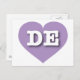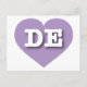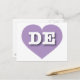 Cette carte postale est dotée d'un coeur de lavande vibrant contenant les lettres coques en haut, blanches et audacieuses DE, l'abréviation officielle du Delaware, le premier état. Le verso de la carte postale est vide, en attendant vos sentiments manuscrits ou le texte customisé.