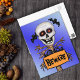 Le design est tiré de mon oeuvre d'origine. Ce crâne blanc déplaisant et souriant a des yeux rouges et un air menaçant. Il a des branches brunes éffrayantes pour les bras et tient un signe orange et noir. Il y a des chauves-souris noires qui volent dans l'arrière - plan. Voir mon magasin Art by MAR pour apparier les produits avec ce design.