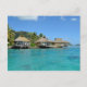 Carte postale avec bungalows de luxe au toit de chaume surplombant l'eau dans un resort de Moorea, une île près de Tahiti en Polynésie française.