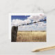 Extérieur australien : poteau de clôture patiné, barbelé rouillé, nuages bas contre un ciel bleu.. rustique, campagnard, poétique même.. simple mais vraiment beau..
