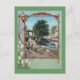 Un mouton et son chien poussent un troupeau de moutons et d'agneaux sur un chemin de terre au-delà d'un lac où se trouve une vache. La vignette est encadrée de branches de bois nu et de tulipes blanches. Une cloche sonne dans cette carte de gratte-ciel victorien datant de la fin des années 1800.