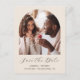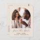 Cette carte postale simple et minimaliste Save the Date présente une photo en forme d'arc au-dessus des mots "Save the Date" dans un élégant script d'écriture manuscrite blanche, suivi des noms du couple, date mariage et ville en sans serif police sur un arrière - plan beige. Ajoutez une deuxième photo horizontale rectangulaire au dos, ainsi que votre adresse de retour et le texte supplémentaire avec plus d'informations ou de détails.