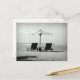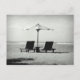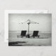 Carte postale avec photo en noir et blanc montrant deux transats et un parasol sur une plage. Prise à Sanur Beach sur Bali Island.
