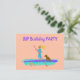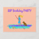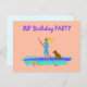 Carte postale d'invitation à une fête d'anniversaire pour adolescente avec un thème de paddleboard debout. La conception illustrée montre une fille pagayant sur sa planche avec son chien à bord, tandis qu'une tortue de mer nage à côté. Personnalisez le texte du modèle sur le recto et le verso pour une fête de rassemblement. L'adresse postale peut être ajoutée séparément à chaque invitation de fête.