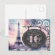 Ooh La La ! Invitation à une soirée d'anniversaire Sweet 16 de style vintage parisien "Nuit à Paris". Le panneau de rue français comprend les détails de la fête, qui peuvent être personnalisés ainsi que les informations de RSVP dans le coin supérieur gauche. Parfait pour une fête d'anniversaire organisée à Paris ou simplement une fête sur le thème français. Des dégradés roses chics servent de fond de coucher de soleil à la Tour Eiffel et au panneau rétro.