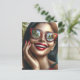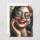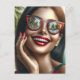 Restez en contact avec cette jolie carte postale. Une belle femme joyeuse souriant avec rouge à lèvres et lunettes de soleil avec un reflet de palmiers en eux.