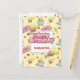Design coloré d'anniversaire avec bonbons et fraises d'anniversaire, gâteau d'anniversaire, crème glacée et ballons aux couleurs joyeuses. Joyeux motif avec un badge pour un jour de naissance heureux. Personnaliser pour remplir votre propre nom ou ajouter votre propre touche.
