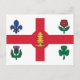 Carte postale avec le drapeau de Montréal, la ville la plus peuplée de la province de Québec, Canada. Drapeau blanc avec croix rouge, pin blanc, fleur de lys bleu, rose rouge de Lancaster, shamrock et chardon