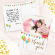 Balloon Bunting drapeaux Merci Anniversaire Photo Carte Postale. Merci à votre invité d'être venu à la fête d'anniversaire de votre enfant! Le design a coloré fête d'anniversaire bottant drapeaux et ballons et une photo - insérez votre photo dans le modèle. Personnalisez la note de remerciement et le nom.