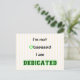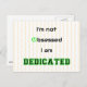 Une carte postale amusante avec le texte "Je ne suis pas obsédée je suis dédiée" en lettres noires. L'O d'obsédée est en forme de bouton de puissance d'ordinateur, et l'arrière - plan est un motif binaire répétant de 0 et 1. Pour quiconque aime passer du temps sur son ordinateur.