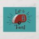 Le design rétro de cette carte postale rappelle les publicités imprimées des années 50 et du début des années 60 avec un camper à larmes en rouge et argent vintage et l’expression "Voyageons !" À partir de mon numériquement original créé image.