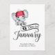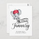 Adorable bébé éléphant en tricot rouge casquette avec pom pom blanc, typographie "Due in January", et modèle pour message spécial annonçant la grossesse.