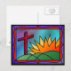 Un design en vitrail illustrant le matin de Pâques, avec une croix rouge sur des collines verdoyantes au bord d'un lever de soleil enflammé.