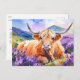 Une carte postale charmant à l'aquarelle avec une vache écossaise shaggy reposant en cuir violet. Idéal pour envoyer des notes, des cadeaux, ou pour encadrer comme décor rustique de ferme.