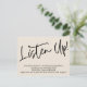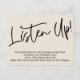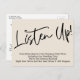 Si vous préférez simple et décontracté, ceci pourrait être la carte de faire-part pour vous. L'avant comporte un en-tête graphique que j'ai conçu en utilisant une police d'écriture moderne et décontractée, qui dit "Écoute !". En bas, il y a un message avec un ton de conversation que vous pouvez modifier, qui déclare les nouvelles sur la nécessité de changer votre date de mariage. Utilisez les champs modèles pour ajouter vos données personnelles et modifier n'importe quel de mes projets de texte pour répondre à vos besoins et à votre situation. L'arrière - plan peut être changé en n'importe quelle couleur.