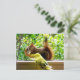Carte postale avec photo d'un oiseau bougie jaune perché à la fenêtre et regardant un écureuil rouge s'étouffer.