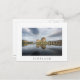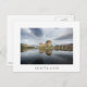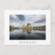 Carte postale de l'historique château Eilean Donan dans un matin calme avec réflexion dans l'eau calme sur la côte ouest de l'Ecosse, près de l'île de Skye avec une frontière blanche et le texte 'Ecosse'.