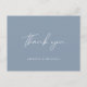 Simple et moderne Calligraphie Script Merci Postcard dans élégant Dusty Blue à envoyer après votre mariage. Customisez-le avec vos propres noms sur le devant et le message au verso ou supprimez le texte au verso et ajoutez votre note manuscrite.