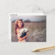 Cette élégante carte postale de remise de diplômes vous offre une photo complète et une calligraphie élégante. "Merci" est écrit dans un joli script blanc dans le coin inférieur droit, avec le nom du diplômé et l'année de fin d'études ci-dessous. Ce design de typographie blanche recouvre une photo complète du nouveau diplômé (orientation horizontale/paysage). À l'arrière, vous pouvez écrire un message personnalisé aux destinataires ou supprimer le texte modèle pour créer une zone vide pour une note manuscrite.