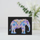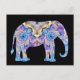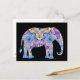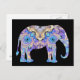 Un éléphant kaléidoscope à superbes motifs orne cette carte postale. L'éléphant a des couleurs marbrées de turquoise, violet, or, lavande et blanc contre un arrière - plan noir.