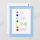 Design minimaliste de charme carte postale de bien-être avec un simple 7-Chakra graphique et personnalisable "Manger. Dormir. Équilibre. Répétez." message et cadre bleu ciel. Idéal pour les moniteurs de yoga, les massothérapeutes et autres qui pratiquent le bien-être holistique et la méditation.